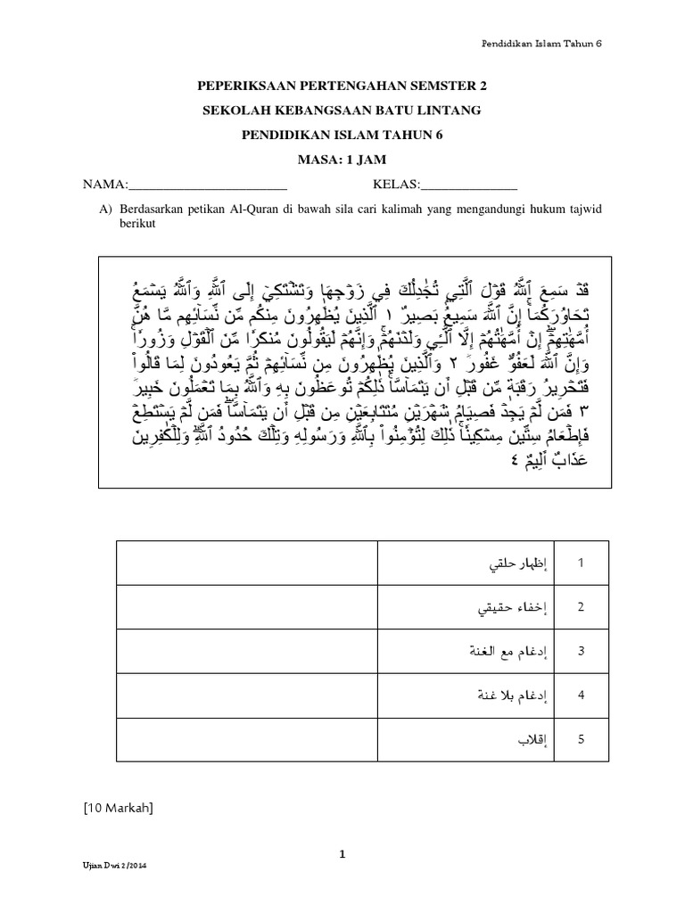 Ujian Pendidikan Islam Tahun 6 Pertengahan Semester 2014 Pdf